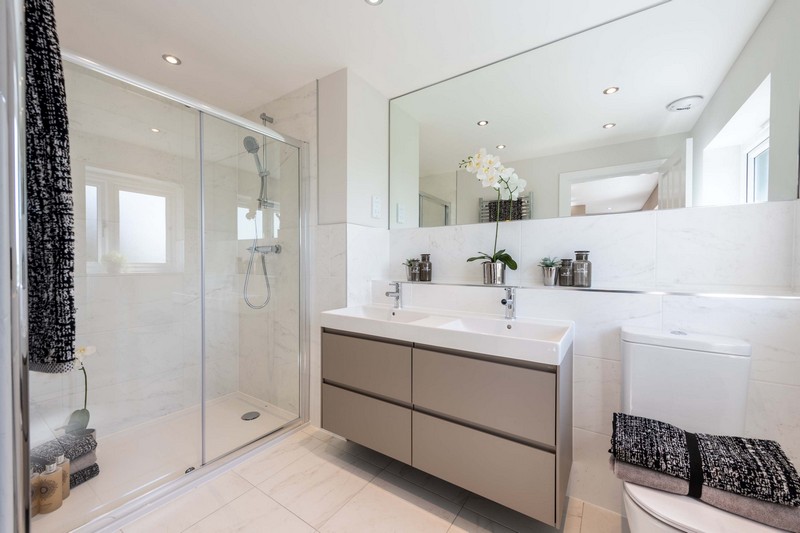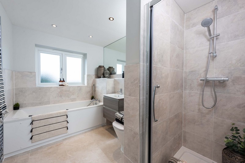 - Full height ceramic tiling around bath and shower cubicles, half height to all other walls.